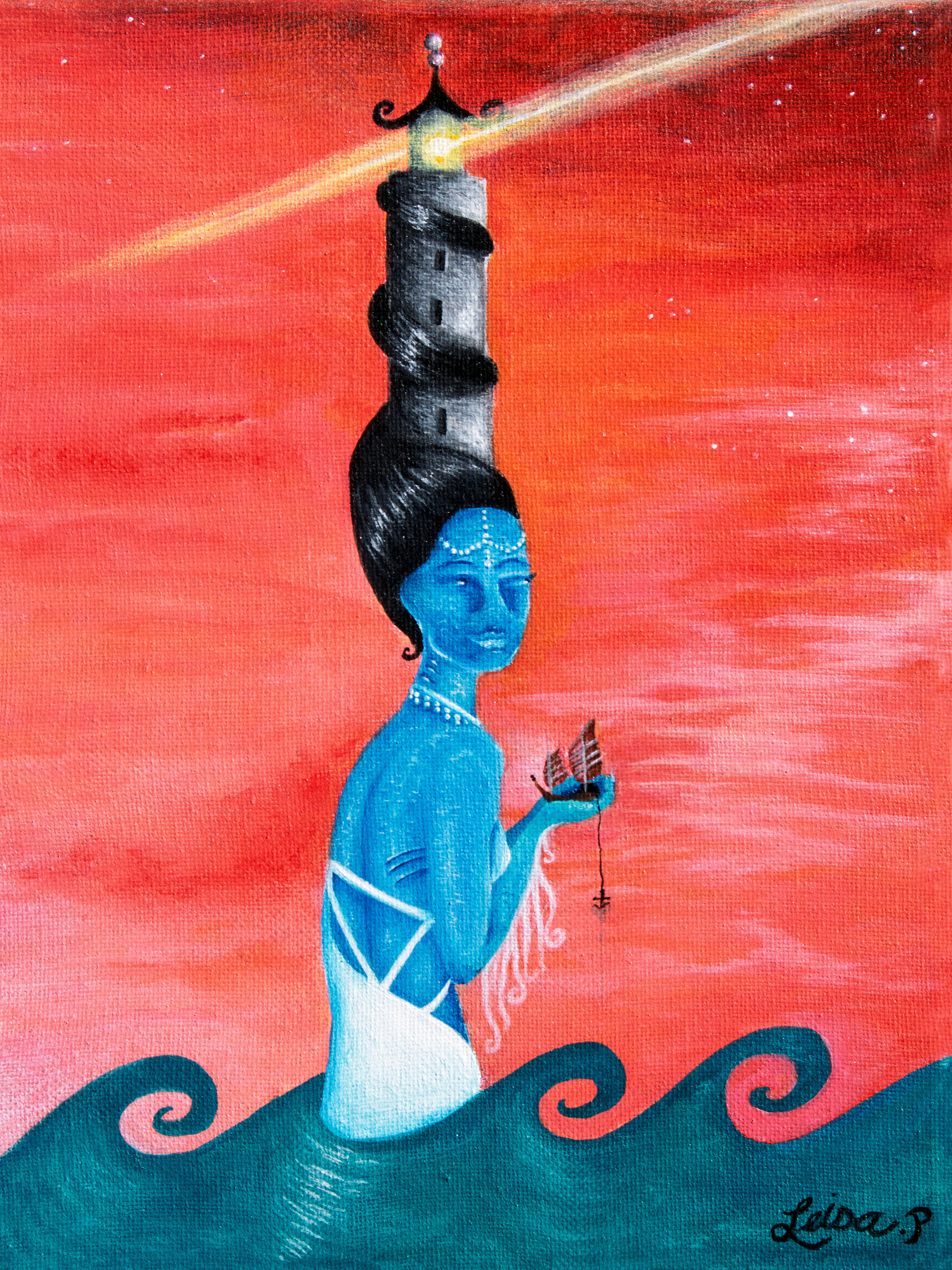 One evening ,in a lonely room, vibing to a new band my mom introduced me to, I started to daydream about my next painting. Light house lady was born. She comes to rescue lost boats out at sea. During this time, I was going through a break up. The relationship unfortunately was codependent and toxic. Maybe a hint of that encouraged the painting as well. I tend to notice a pattern with my paints. Current events can influence your work too.